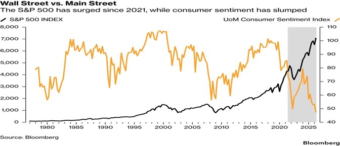 Wall Street versus Main Street: While the S&P 500 reached a record high this week, the University of Michigan Consumer Sentiment Index hit an all-time low, illustrating our view that the Fed’s policies that created asset bubbles and inflation have hurt most Americans.