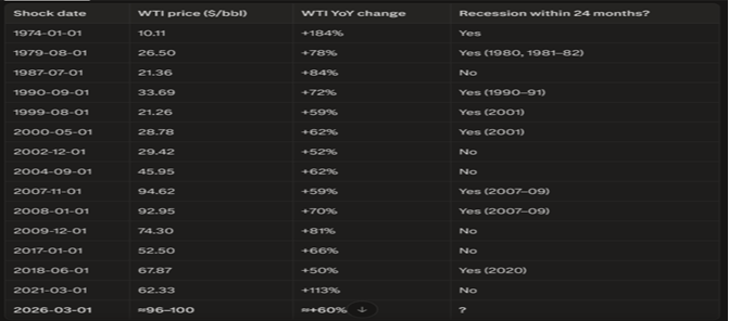 In 8 of the 14 historical episodes where oil prices spiked more than 50% year‑over‑year, a U.S. recession followed within the next two years -- a pattern that underscores how dangerous today’s oil shock could be for the economy.