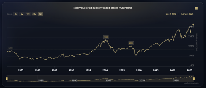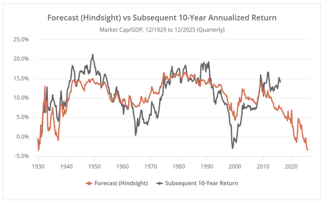 Two robust long-term valuation models—Market Value to GDP and Shiller’s CAPE—indicate that the S&P 500 is projected to deliver annual returns between -3.4% and 1.4% over the next decade. Given that 10-year Treasury Inflation-Protected Securities (TIPS) currently yield a real return of 1.94%, equities are substantially overvalued and present an unattractive risk premium.