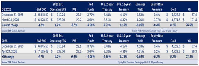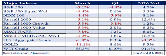After a strong 2025, stocks finished the first quarter lower as the conflict with Iran and the effective closure of the Strait of Hormuz triggered an 84% spike in oil prices and a sharp risk‑off move. In this environment, the SP 500 declined 4.2% for the quarter, while the equal-weighted SP 500 and the Russell 2000 small-cap indexes still managed modest gains of 0.9% and 0.6%, respectively. International stocks continued to outperform, with the MSCI EAFE Index up 1.2% and the MSCI Emerging Markets Index up 3.8%, helped by more attractive valuations and tailwinds from rising commodity prices.