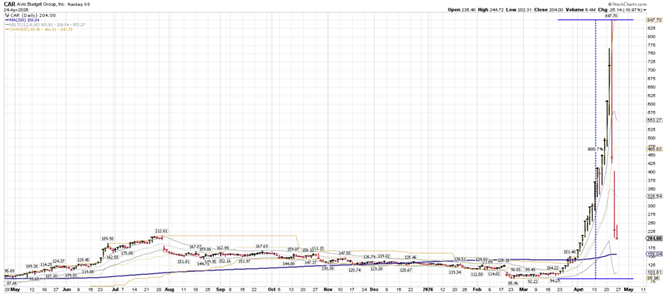 Avis Budget Group, the rental car company, is another example of the mania and speculative excess in the three-week rally. A highly leveraged car rental company with a tough, cyclical business suddenly morphed into a meme stock, and its shares spiked about 900% in a matter of weeks due to a short squeeze and retail FOMO, rather than any meaningful change in fundamentals.