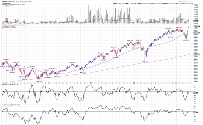 After a strong 2025, stocks finished the first quarter lower as the conflict with Iran and the effective closure of the Strait of Hormuz triggered an 84% spike in oil prices and a sharp risk‑off move. In this environment, the S&P 500 declined 4.2% for the quarter, while the equal-weighted S&P 500 and the Russell 2000 small-cap indexes still managed modest gains of 0.9% and 0.6%, respectively. International stocks continued to outperform, with the MSCI EAFE Index up 1.2% and the MSCI Emerging Markets Index up 3.8%, helped by more attractive valuations and tailwinds from rising commodity prices.On April 7, 2026, President Trump announced a two‑week ceasefire with Iran that included plans to reopen the Strait of Hormuz. Stocks surged on the news, and the S&P 500 went on to hit a new all‑time high six days later as investors rushed to buy the dip.