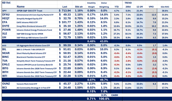 The benchmark for our model portfolio is the Traditional Blend — 60% equity and 40% bonds. Our goal is to outperform the benchmark with less risk. To outperform, our investment portfolio is diversified and economically balanced. We eliminate laggards and tilt the portfolio toward our location in the business cycle. Finally, to manage risk, we volatility-weight our positions and set a volatility target equal to our benchmark's historic risk level. When volatility increases, our asset allocation dynamically reduces our equity risk exposure.