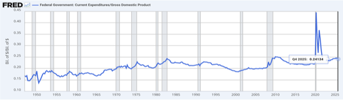 Through Q4 2025, government revenue growth (11.4%) outpaced spending growth (4.6%), aided by tariff revenue and a reduced Federal workforce. Yet the deficit remains unsustainably large at $1.7 trillion (5.3% of GDP). The problem is spending, not revenue: government receipts at 18.8% of GDP sit above the 55-year average of 17.9%, while spending is 24.2% of GDP—2.2 percentage points above historical norms, or $690 billion annually. Importantly, this recessionary level of spending persists even though the unemployment rate is only 4.3%.