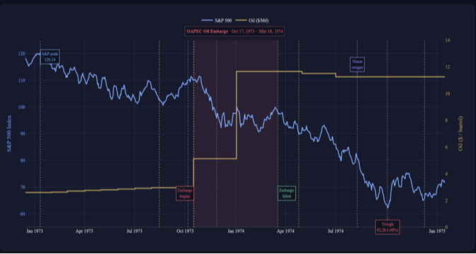 Sources: S&P 500 daily closes via Yahoo Finance (^GSPC). Oil prices: Saudi Arabian Light posted price perFederal Reserve History — Oil Shock of 1973-74OPEC archives.