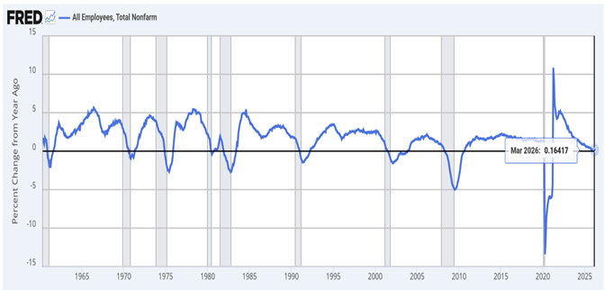 In our view, the economy has too much debt and too little underlying growth to comfortably absorb a sustained oil shock. Over the past year, overall payrolls have been essentially flat—up just 0.16%—and from March 2025 to March 2026, health care and social assistance alone generated roughly 680,000 new jobs, more than the entire net gain in U.S. employment, while the rest of the economy, in aggregate, lost jobs. The credit‑sensitive, cyclical parts of the economy have shown little growth, and we are concerned that this oil shock could be the catalyst that tips them into a downturn.