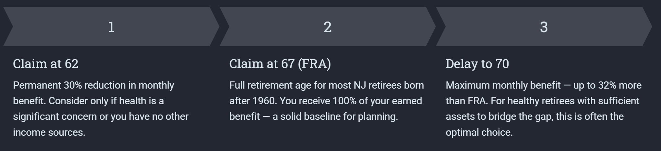 Because New Jersey fully exempts Social Security from state income tax, optimizing when you claim becomes even more powerful. The federal benefit alone grows by approximately 8% per year for every year you delay claiming between age 62 and 70 — and every dollar of that increase arrives completely free of NJ state tax.