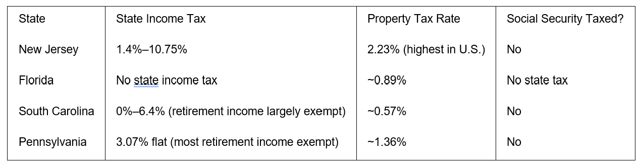 For retirees with homes valued above $600,000 — common in Somerset, Morris, and Monmouth counties — annual property taxes can easily exceed $15,000–$20,000. Even with maximum relief programs, this fixed cost shapes whether staying in NJ makes financial sense. It is one of the most consequential variables in any NJ retirement income plan.