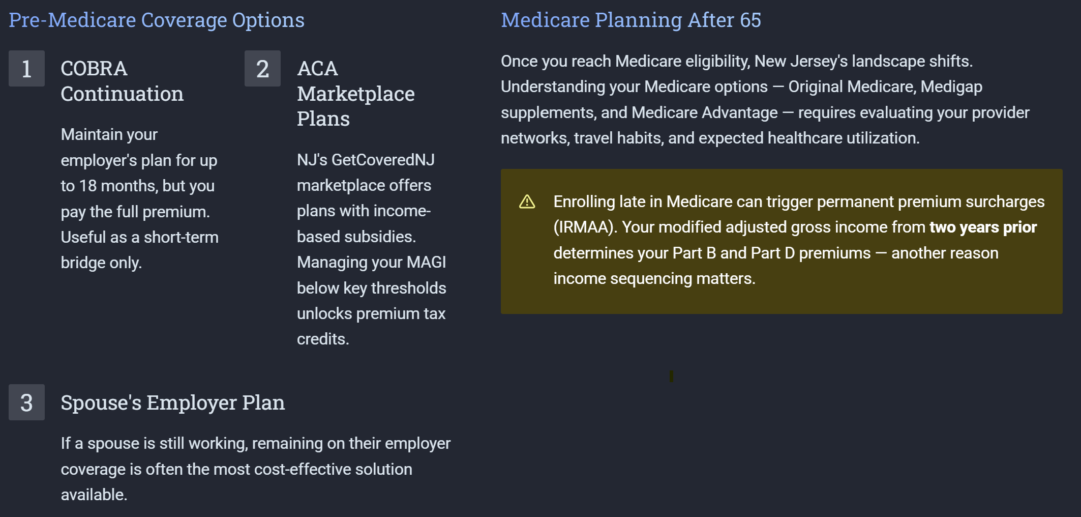 - Medicare planning — coordinating supplement plans, Part D, and healthcare costs with retirement income