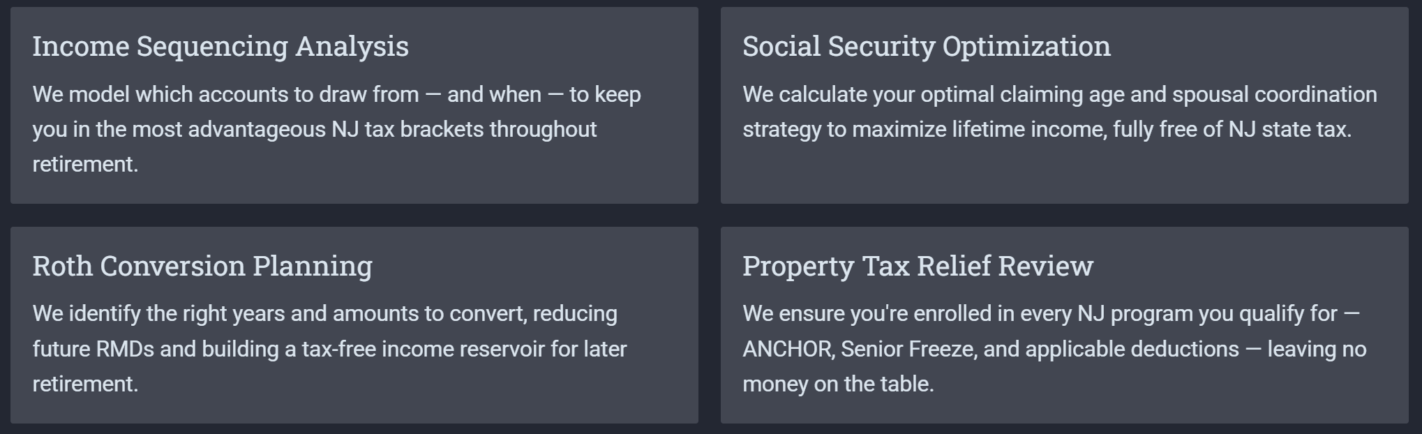 - NJ exclusion threshold management — keeping income in the right bands to maximize state tax savings