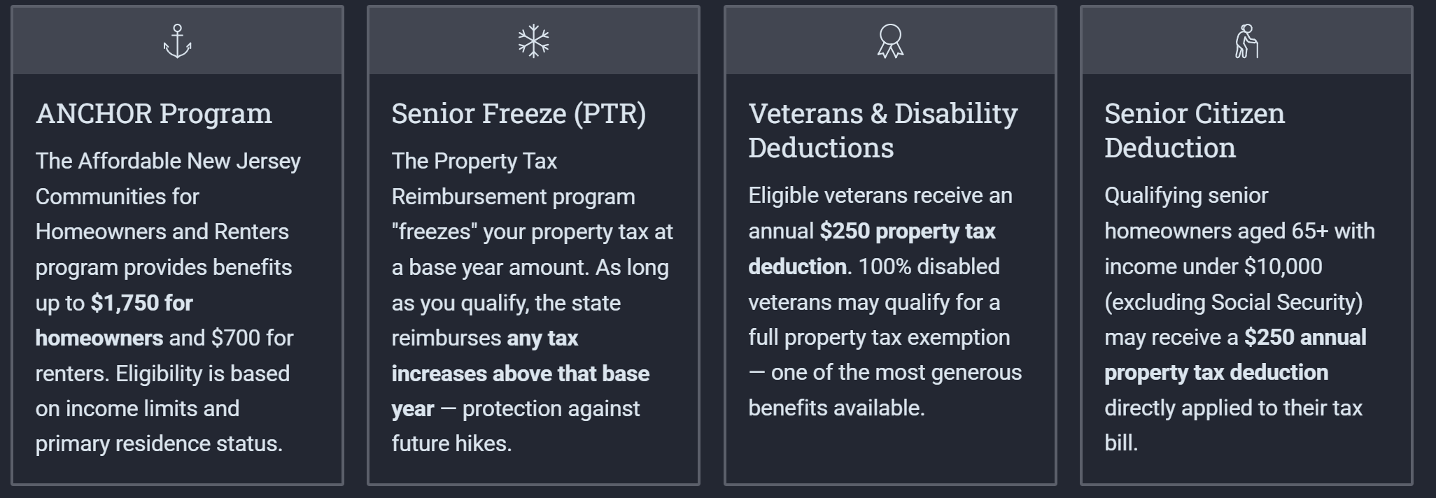 - ANCHOR (Affordable New Jersey Communities for Homeowners and Renters): ANCHOR provides direct property tax relief to NJ homeowners and renters. According to the NJ Division of Taxation, eligible homeowners can receive up to $1,500 in relief (plus an additional $250 for seniors), while eligible renters can receive up to $450. Income limits apply: $250,000 for homeowners, $150,000 for renters.