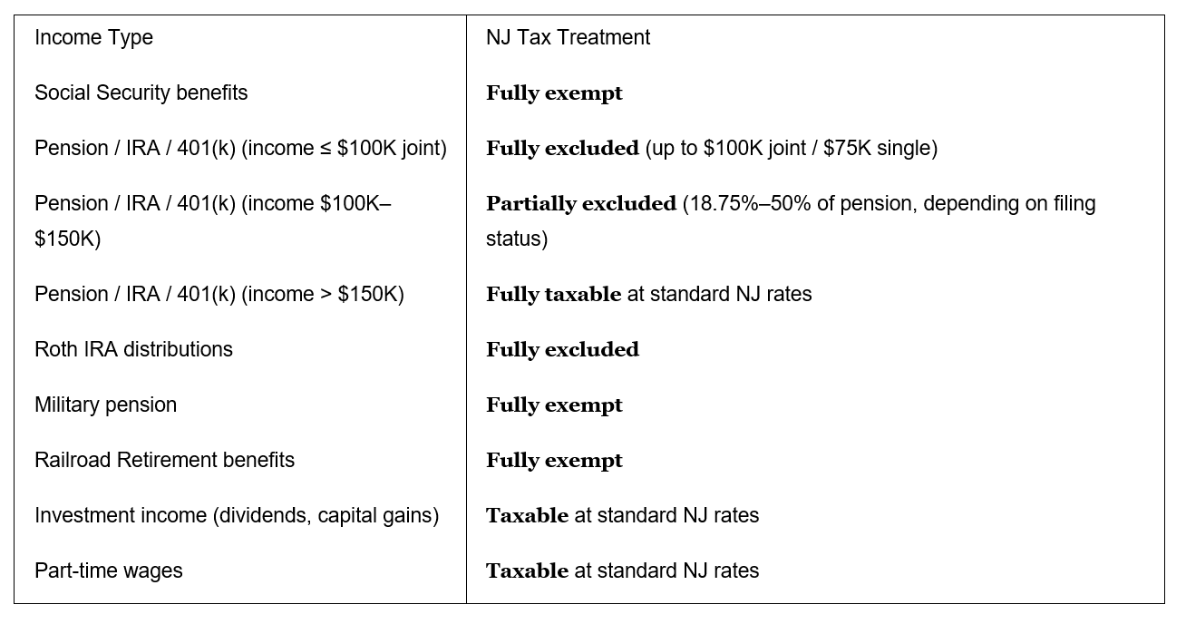 - Pensions, IRAs, and 401(k) plans — tax-deferred accounts subject to NJ's exclusion thresholds
